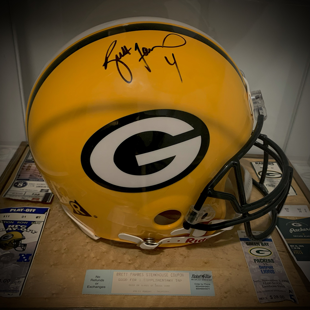 This is one of the only items in my collection that I did not receive personally. This helmet was won in a raffle and gifted to me however that does not diminish the meaning of the item at all. Growing up, Brett Favre was my favorite player. He was the reason I became interested in football and I got the pleasure of watching him quarterback the Packers to a win at my first game in 2006. If it weren’t for Brett, I would not have the love for football that I do today.