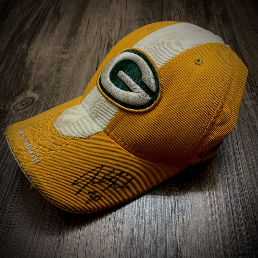During the 2010 Packers Fan Fest, I attended the kids football camp and was able to meet and play with a number of current and former Packers. After the camp ended, all the players had autograph availability and I had the pleasure of meeting fullback, John Kuhn. This was my second time meeting him in only a few hours and I had already had another item signed by him so I gave him the hat that I was wearing and he signed that. It was a great interaction as he remembered me from before and we talked for a few minutes as he signed it.